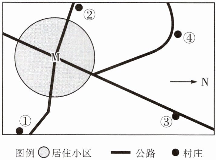 新农村建设在某乡镇全面展开,下图是该乡镇新农村建设规划示意图,以图中 M 地为中心的 3 千米内建居住小区,图中居住小区半径的图上距离大约为 1 厘米。读图,完成 3~4 题。