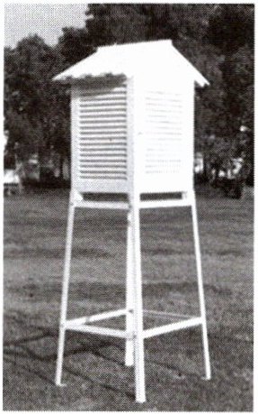 百叶箱是一种安装温、湿度仪器用的防护设备,一般都架设在离地1.5米的空旷草地上。百叶箱的四壁由许多木板条组成,不仅能通风,而且能使阳光不直接照射箱内的仪器。在我国,气象观测中使用的百叶箱一般为白色。在同一时间、同一地点,放在百叶箱内测得的气温和放在外面直接测量的气温相比,百叶箱内的气温更能反映空气的真实温度。
