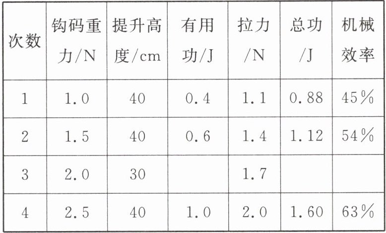$ J $。(3)某同学认为,由相同的滑轮所组成的不同的滑轮组提升同一个重物时,越省力的滑轮组机械效率越大,他的想法正确吗?请你利用补充完整后的表格中的数据说明你的判断:______。