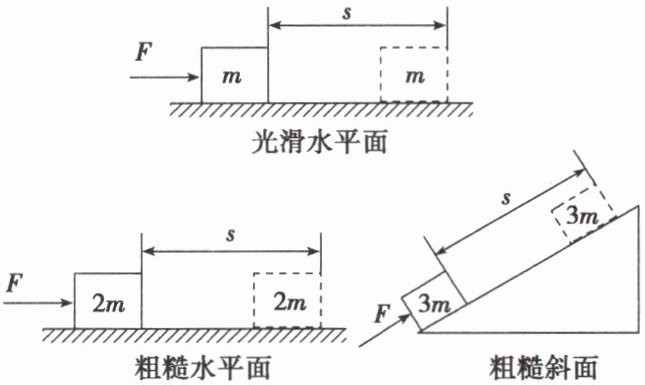 2. 一个人先后用同样大小的力 $ F $ 将不同质量的物体分别在光滑水平面、粗糙水平面和粗糙斜面上沿力的方向移动相同的距离 $ s $(如图所示),若该力在这三个过程中所做的功分别为 $ W_1 $、$ W_2 $、$ W_3 $,则它们之间的大小关系是(