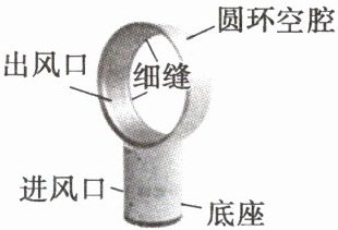 9. 如图所示是一款无叶风扇,风扇底座表面有进风口,内部有电动机,正常工作时将空气吸入并压缩进入圆环空腔,再从圆环空腔的细缝中高速吹出,气流夹带着周围的空气一起向前流动。出风口的空气温度____(选填“高于”“低于”或“等于”)圆环空腔内的空气温度,原因是____。