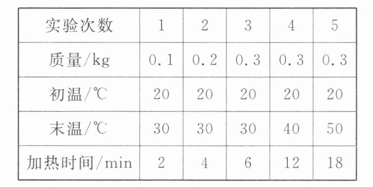 4. 在探究“水吸收的热量与水的质量和水升高的温度是否有关”的实验中,记录的实验数据如表所示。