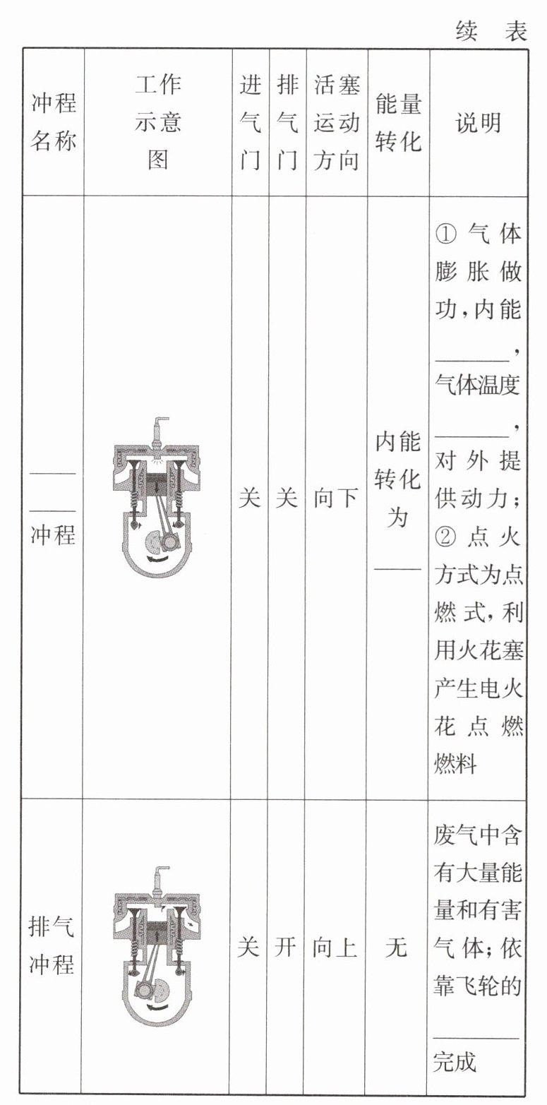 注意:汽油机的 1 个工作循环内有 4 个冲程,活塞往返 2 次,飞轮转动 2 圈,对外做功 1 次。