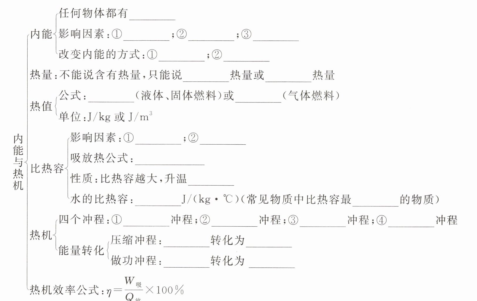 内能 质量 状态 温度 做功 热传递 放出 吸收 $Q_{放}=mq$ $Q_{放}=Vq$ 物质种类 状态 $Q=cm\Delta t$ 越慢 $4.2×10^{3}$ 大 吸气 压缩 做功 排气 机械能 内能 内能 机械能