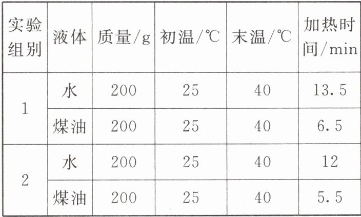 (2)通过分析实验数据可知,质量相同的水和煤油升高相同温度,水加热时间长,水吸收的热量多,得出的结论是水的吸热能力大于煤油的吸热能力。