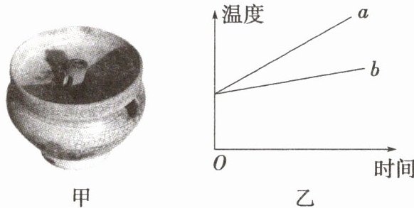 12.【解析】瓷盏比铜盏省油是因为$c_{陶瓷}>c_{铜}$,可以吸收更多的热量,从而使油的温度不会太高,降低耗油量。如图乙所示是铜和陶瓷温度随时间变化的大致关系图,加热相同时间,吸收相同的热量,比热容小升温快,其中a是铜的关系图。