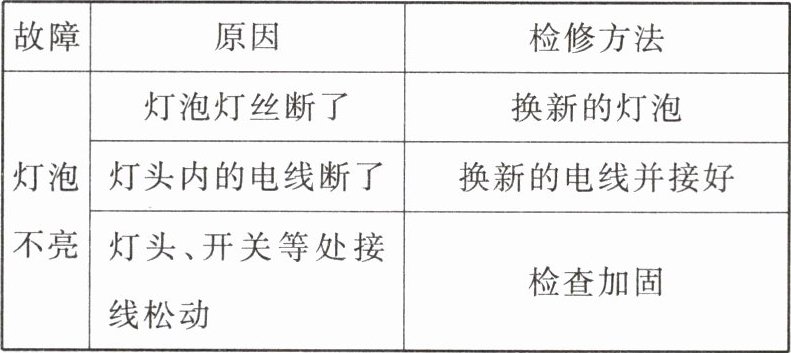 7. 同学们通过实践列出了白炽灯的常见故障与检修方法,其中一项的相关情况如下表所示,这个故障的原因可以概括成一个,即(