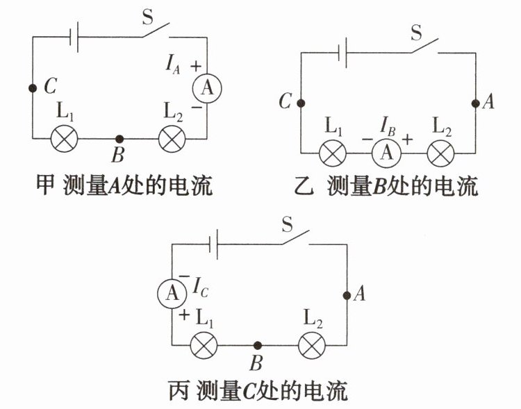 b. 分别读出电流表在 $A$、$B$、$C$ 三处的示数;