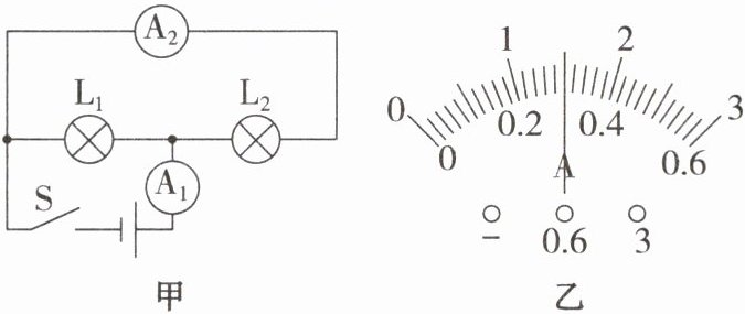 如图甲电路,闭合开关 $S$ 后,两个灯泡都能发光,乙图为电流表 $A_1$ 指针的位置,电流表 $A_2$ 的示数是 $0.6\ A$,下列分析正确的是( )。