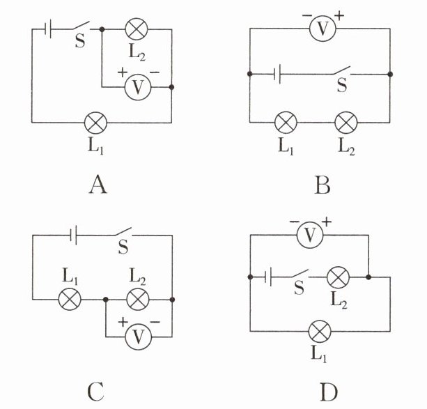 5. 在如图所示的电路图中,能用电压表正确测出灯 L₂ 两端电压的是(