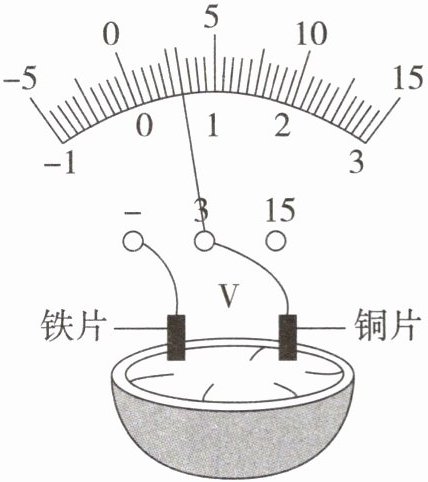 9. 如图所示,取一个橙子,把铜片、铁片插入其中制成一个水果电池,用电压表测量该水果电池两端的电压。图中,插在橙子中的