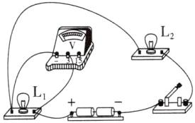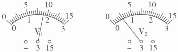 7. 如图所示,两只电压表所用的量程不明,但已知电压表 V₁ 的示数比电压表 V₂ 的示数小一些,则 V₁ 的示数为