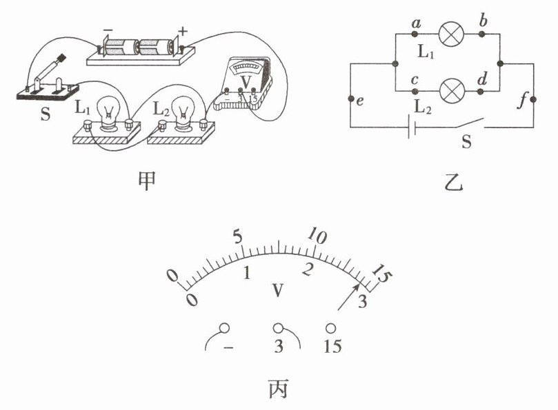 (2)图乙所示的电路中,将电压表并联在$a$、$b$两点之间时,闭合开关,电压表的示数如图丙所示,电压表的示数为