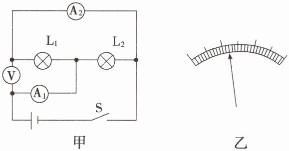 9. 如图甲所示电路,当$S$闭合时,$A_1$、$A_2$、$V$三只电表的指针均如图乙所示,已知电压表接入的是“$-$”“$15$”,电流表量程为$0\sim0.6A$或$0\sim3A$。