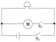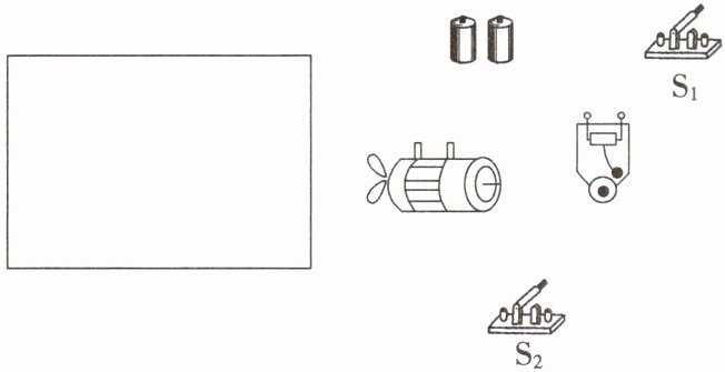 15. (2025·梅州期末)如图所示,有一只电铃、一台玩具电动机、两只开关、两节电池、几条导线,要求:开关S₁、S₂同时闭合时,电铃响,电动机工作;开关S₁闭合、S₂断开时,电铃响,小电动机不工作;开关S₁断开,S₂无论闭合还是断开,电铃不响,小电动机也不工作。请你按要求画出电路图,并根据电路图连接实物图。