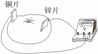 19. (2025·惠州期中)物理课后,振鹏同学与学权同学将一块铜片和一块锌片同时插入西红柿中,做成了一个“西红柿电池”。振鹏和学权想探究西红柿电池的电压与哪些因素有关。振鹏说:“可能与两金属片之间的距离有关。”学权想了想说:“也可能与两金属片插入西红柿的深度有关。”为了验证猜想是否正确,他们找来了电压表,连成了如图所示的电路。