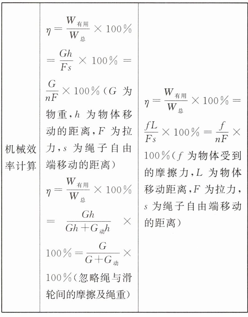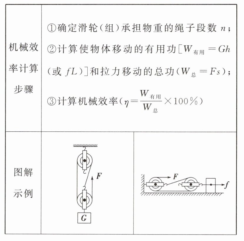 2. 机械效率是有用功与总功的比值,反映机械做功性能的好坏,它与功、功率之间没有直接的大小关系,即机械效率高的机械不代表做的功多,也不代表做功快,只能说明机械的有用功和总功的比值大,能量的利用率高。