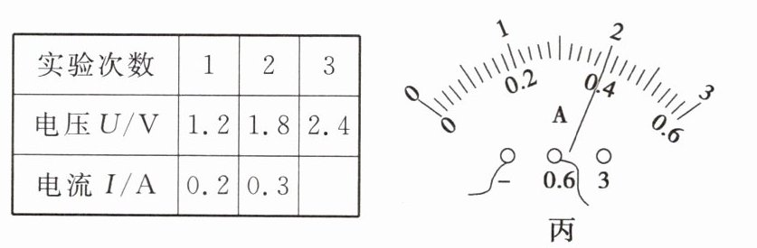 第 3 次实验得到的电流如图丙所示,请你根据所提供的信息求出所测未知电阻的阻值为$ \Omega $。
