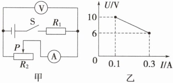 13. (2025·江门模拟)图甲中,电流表的量程为$0~0.6\ {A}$,电压表的量程为$0~15\ {V}$,滑动变阻器$R_{2}$的规格为“$100\ {\Omega}\ \ \ 0.5\ {A}$”。闭合开关$S$后,调节滑动变阻器的滑片$P$,得到电流表与电压表的示数关系如图乙所示,定值电阻$R_{1}$的阻值为