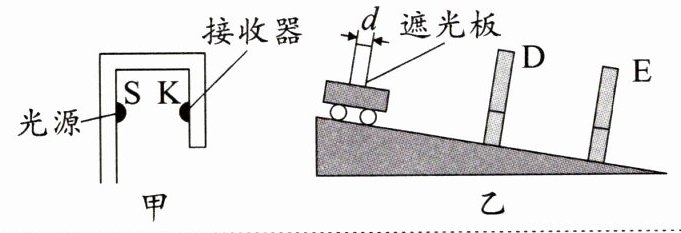 。(10)新考向 创新装置 与计时器相连的光电门(如图甲)可以记录物体通过时遮住光源的时间。如图乙,小车上装有遮光板,$D$、$E$是两个光电门。若遮光板宽度$d= 1cm$,小车从斜面顶端滑下,两光电门计时器记录的时间分别为$t_{D}= 0.01s$、$t_{E}= 0.008s$,则小车通过$D$、$E两光电门时的速度分别为v_{D}= $