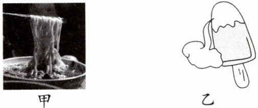1. 易错题 小明早上吃面时,看到面在冒“热气”,如图甲。由此他想到夏天吃雪糕时,看到雪糕周围冒出的“冷气”向下落的情景,如图乙。