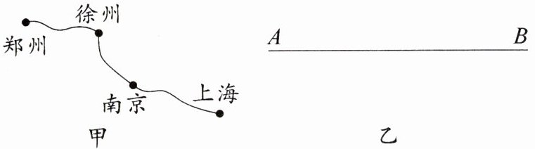 3. [化曲为直法]郑州到上海的铁路线如图甲所示,此图的比例尺为$1:30 000 000$.让无弹性的细线与图上铁路线重合,在两端点做好标记,拉直后两标记间的长度如图乙中$AB$所示.请用分度值为$1 mm$的刻度尺测量,图上郑州到上海铁路线的长度为______mm,则郑州到上海铁路线的实际长度约为______km.