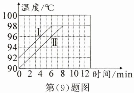 (9)另一实验小组的两位同学分别根据实验数据绘制出温度随时间变化的图线Ⅰ和Ⅱ,由图可知,沸腾前Ⅰ、Ⅱ两条图线不重合的原因是水的