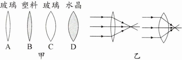 (2)让与主光轴平行的光通过两个材料相同的凸透镜,现象如图乙.由此得出的结论是材料相同的凸透镜的球形表面弯曲程度越大,其焦距越