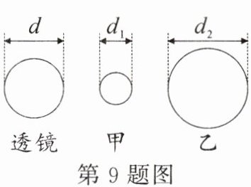 9. 小明为判别直径相同的两透镜的类型,分别将它们正对太阳,在它们的下方各放一张纸,在纸上得到相应的光斑,透镜与光斑直径的大小如图所示$(d_1 < d < d_2).$其中形成甲光斑的是_________(选填“凸”或“凹”)透镜,形成乙光斑的_________(选填“一定”“可能”或“一定不”)是凹透镜.