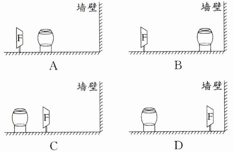 4. 将带有“F”字样的光源放在装有水的鱼缸附近,调整光源和鱼缸的位置,在墙壁上看到一个倒立、放大的“F”,则“F”光源、鱼缸、墙壁三者的位置可能是(
