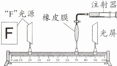 13. (2025贵阳南明区二模)为了探究近视眼的成因,小林组装了图示实验装置,其中“F”字样的光源代替可视物体,光屏模拟视网膜,水透镜模拟晶状体(通过注射器向橡皮膜中抽水或注水可改变橡皮膜的凸起程度)。