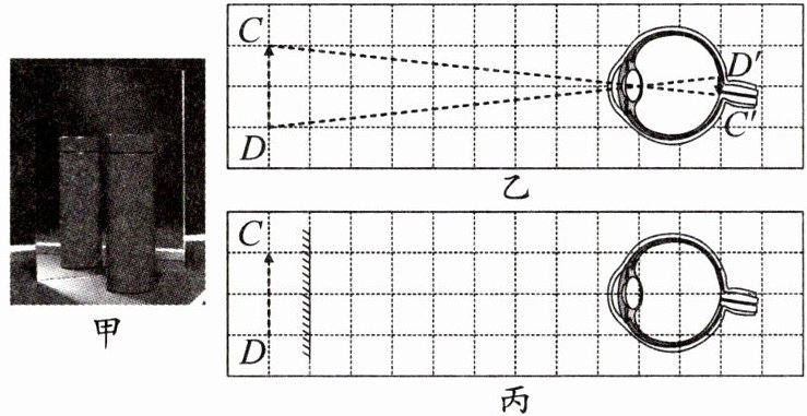 7. 如图甲,在小宁与平面镜之间有一只杯子,为何杯子和杯子的像在小宁眼球视网膜上成的像大小不同?图乙为杯子的像 CD 在视网膜上成像的示意图,请你在图丙中画出杯子 AB 在视网膜上成的像 A'B'。(要求:先根据平面镜成像规律画出 AB,再用图乙的方法画出 A'B')