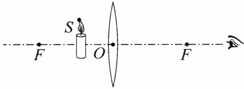 8. 在探究凸透镜成像规律的实验中,小新透过凸透镜看到烛焰 S 的像点 S',画出光路图确定像点 S'的位置,图中 O 为光心,F 为焦点。(保留作图痕迹)