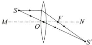 9. 如图,MN 为透镜主光轴,S'是光源 S 通过透镜所成的像,请在图中画出透镜的位置和种类,并确定透镜右侧焦点 F 的位置。(保留作图痕迹)
