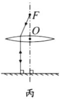 3. (2025 毕节金沙模拟)小明又用该手电筒竖直向下照射在水平放置的平面镜上,侧面的人几乎看不到经平面镜反射后的光,他通过作图明白了其中的道理。如图丙,F 为凸透镜的焦点,请画出图中光线经过凸透镜后的折射光线和经过平面镜反射后的反射光线。