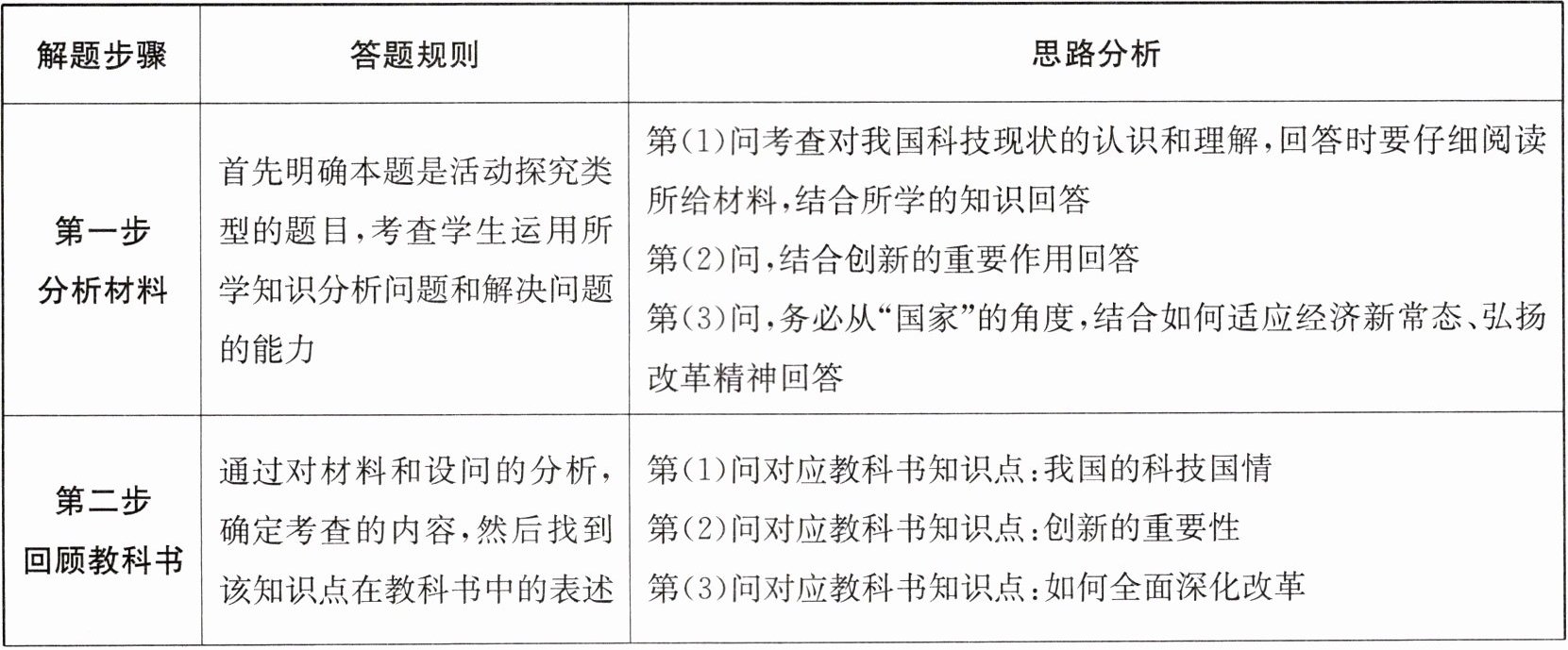 |第二步回顾教科书|通过对材料和设问的分析,确定考查的内容,然后找到该知识点在教科书中的表述|第(1)问对应教科书知识点:我国的科技国情