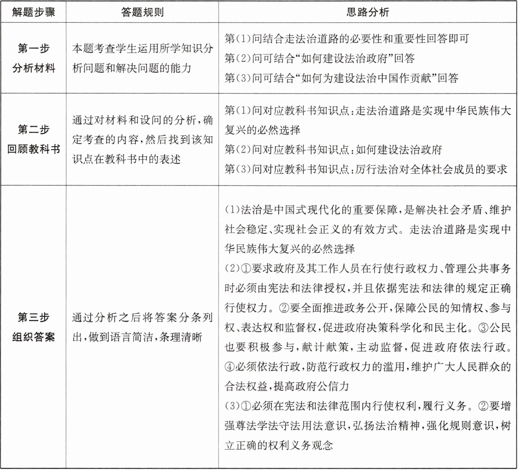 |第二步回顾教科书|通过对材料和设问的分析,确定考查的内容,然后找到该知识点在教科书中的表述|第(1)问对应教科书知识点:走法治道路是实现中华民族伟大复兴的必然选择