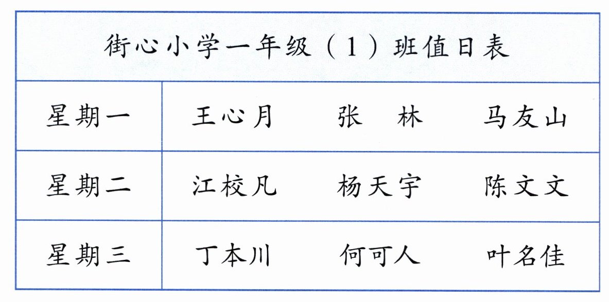 读 读 下 面 的 值 日 表,圈 出 你 认 识 的 字。