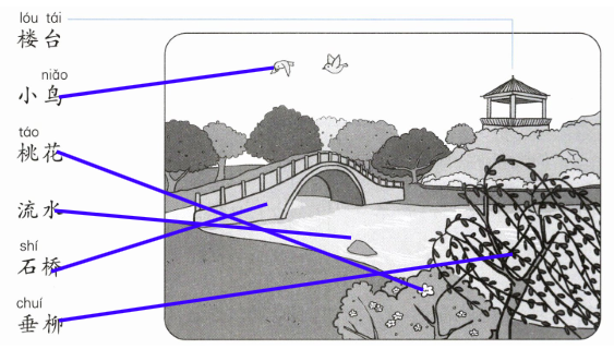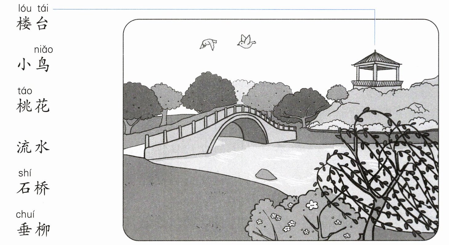 图上有一座石桥,桥下是流水,远处有楼台,近处有垂柳和桃花,天空中有两只小鸟在飞翔。
