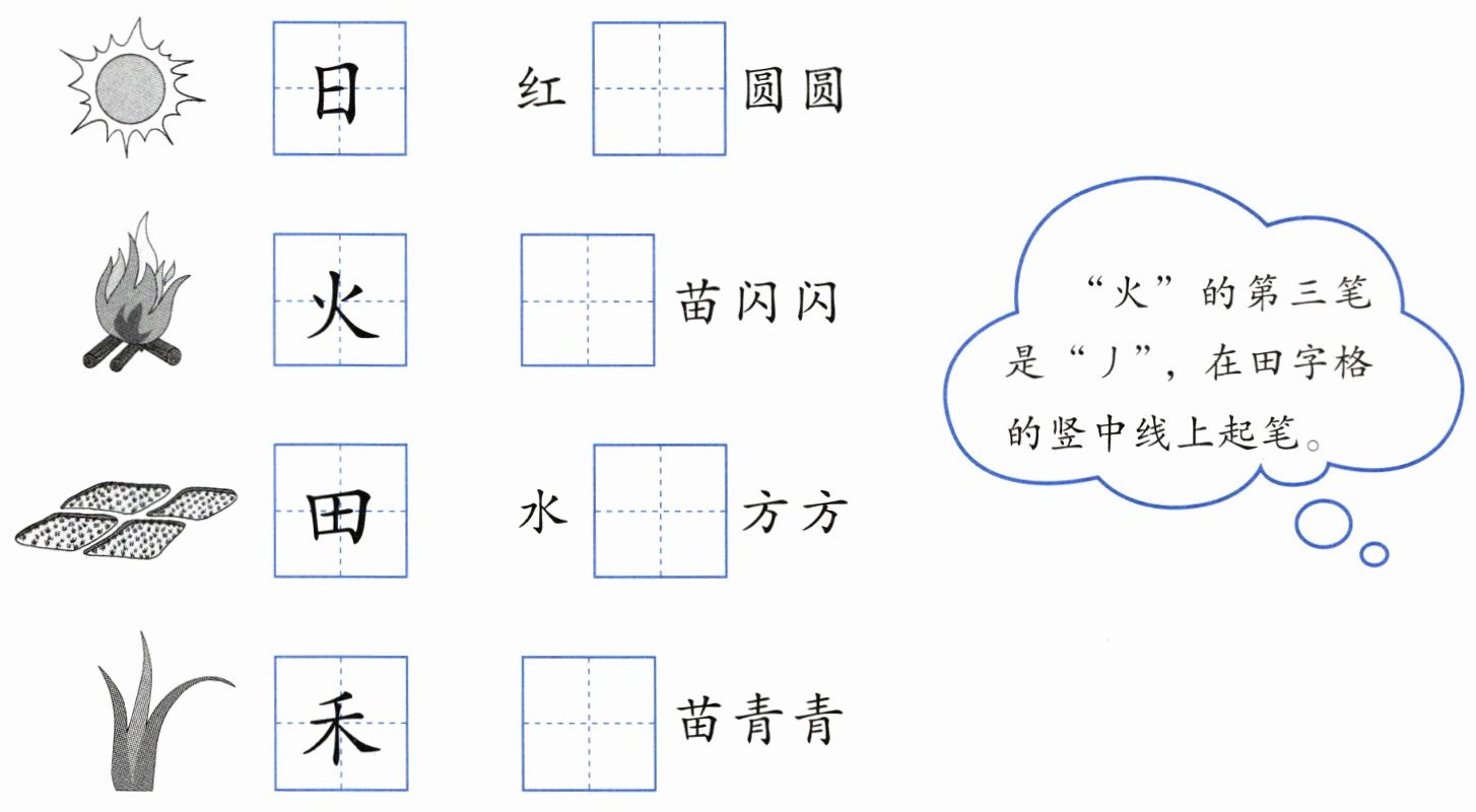 在一年级上册该题目中,按照上述象形画法在对应方框中作画即可。