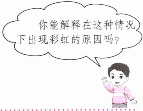 一个天气晴朗的周末,奇奇和几个好朋友到公园玩耍。他们看到公园的自动喷灌装置正在给草坪喷水,当喷头旋转喷水时,背对着太阳会看到彩虹。