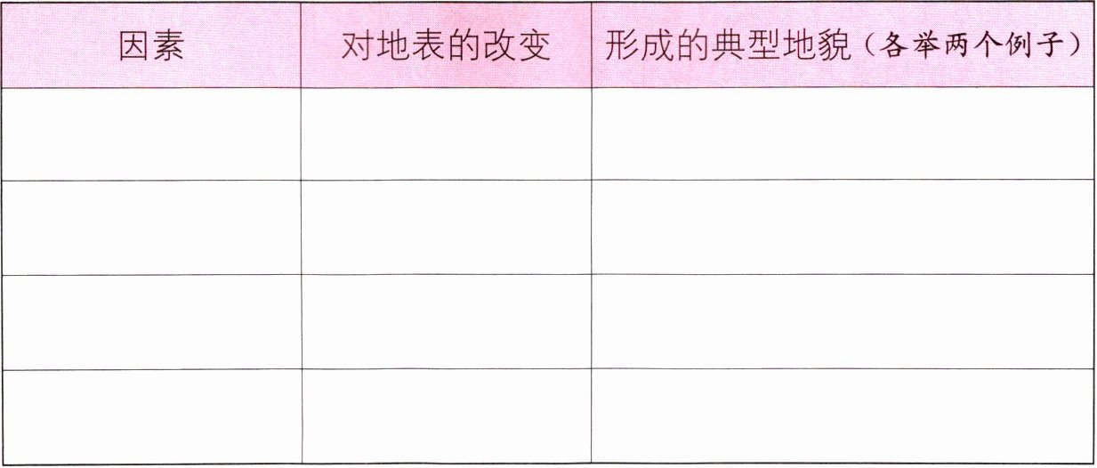 |因素|对地表的改变|形成的典型地貌(各举两个例子)|
