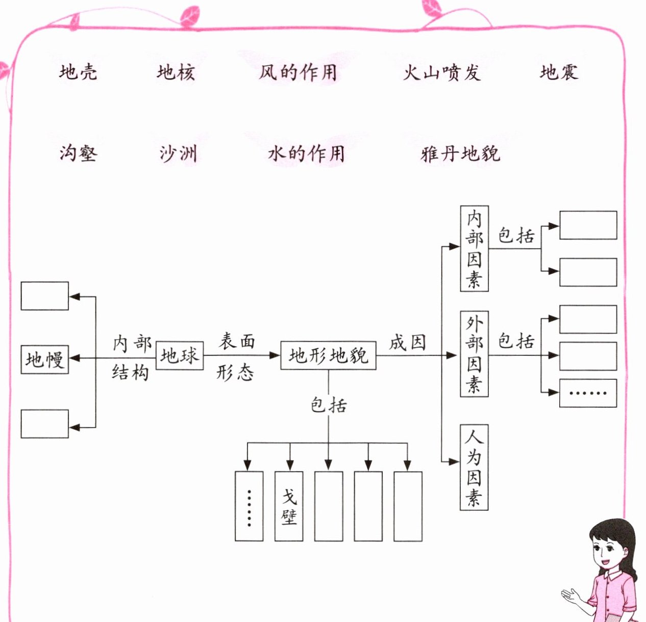左侧两空:地壳、地核;内部因素包括:火山喷发、地震;外部因素包括:风的作用、水的作用;地形地貌包括:沟壑、沙洲、雅丹地貌。