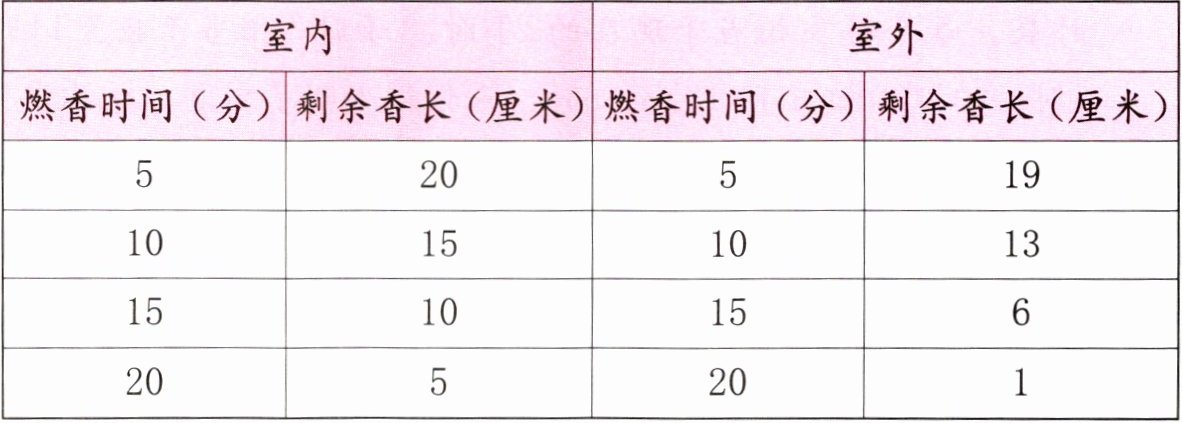4. 下面是乐乐在不同地方观察两支长均为25厘米的同样的香燃烧时的记录表。分析数据,下列说法中正确的是( )。