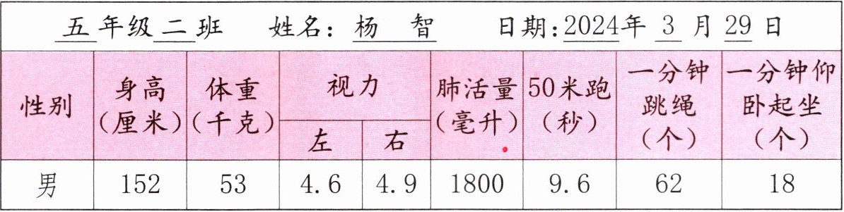 | 性别 | 身高(厘米) | 体重(千克) | 视力 | 肺活量(毫升) | 50米跑(秒) | 一分钟跳绳(个) | 一分钟仰卧起坐(个) |