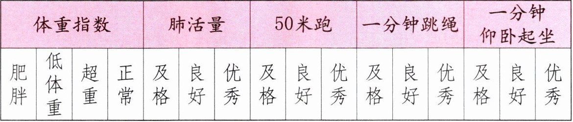 | 肥胖 低体重 超重 正常 | 及格 良好 优秀 | 及格 良好 优秀 | 及格 良好 优秀 | 及格 良好 优秀 |