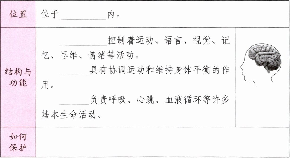 颅腔 大脑 小脑 脑干 充足的睡眠、愉悦的心情(合理即可)