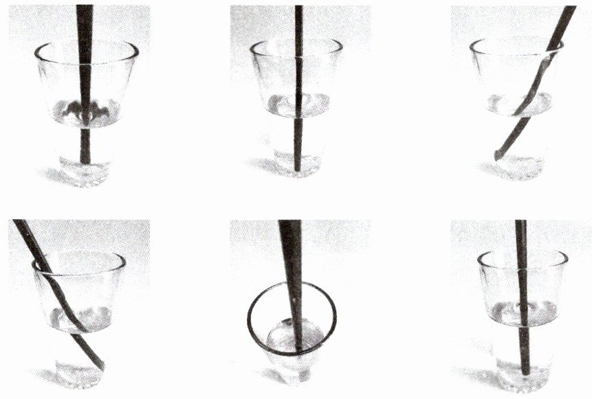1. 下面是一组同学将筷子放入有水的透明杯子中,改变观察的角度、筷子的倾斜度,用相机拍下的现象。分析图中信息,完成填空。