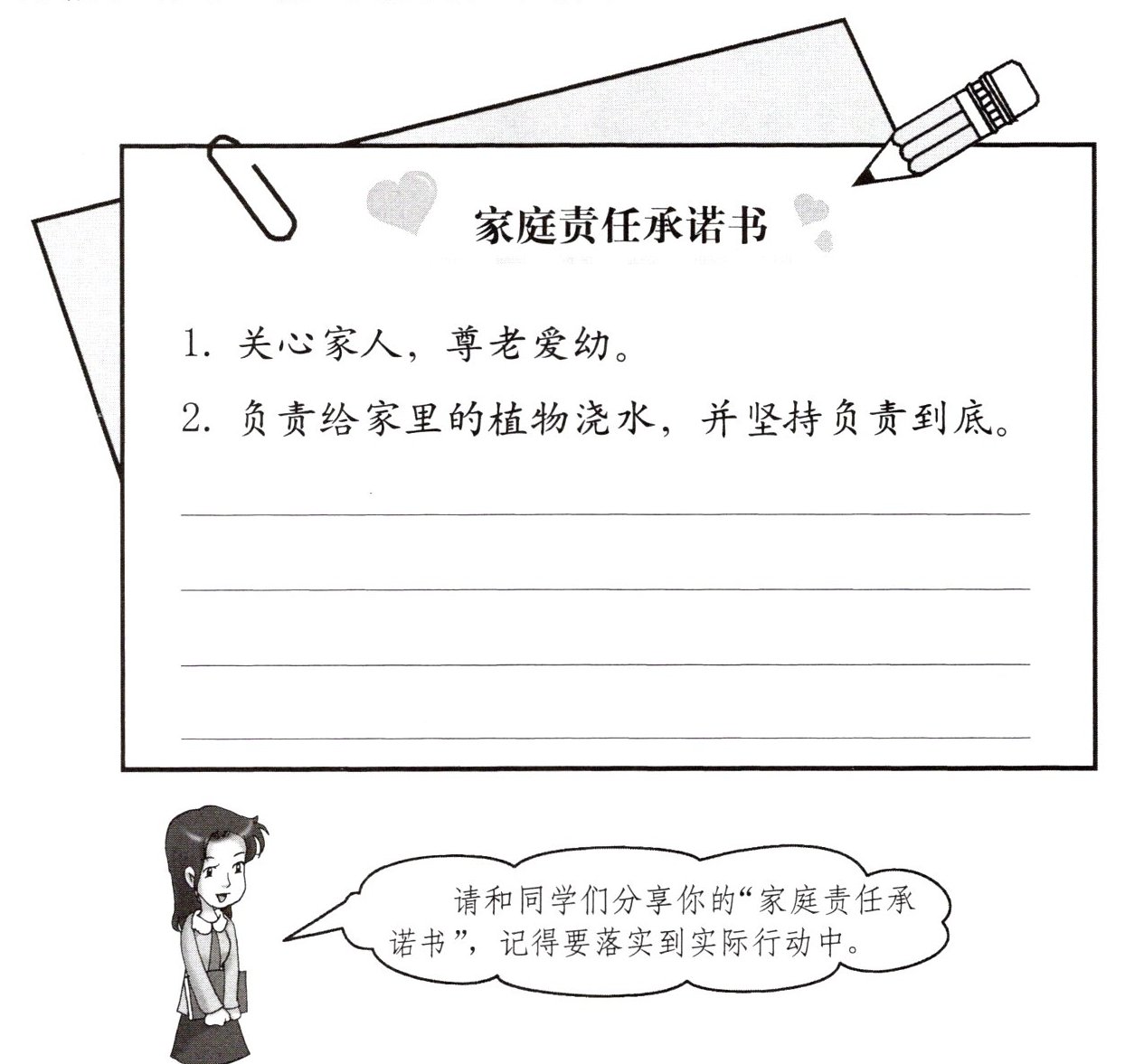 请和同学们分享你的“家庭责任承诺书”,记得要落实到实际行动中。