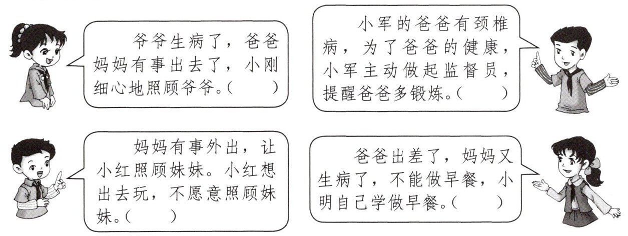 爷爷生病了,爸爸妈妈有事出去了,小刚细心地照顾爷爷。( )